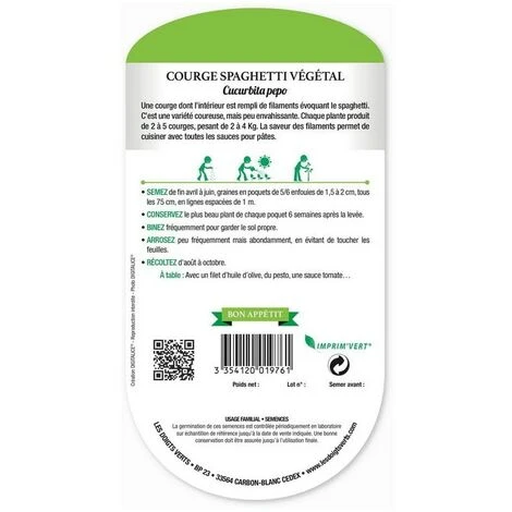 La courge spaghetti végétal est une courge dont l’intérieur est rempli de filaments évoquant le spaghetti. C’est une variété coureuse, mais peu envahissante. Chaque plante produit de 2 à 5 courges, pesant de 2 à 4 Kg. La saveur des filaments permet de cuisiner avec toutes les sauces pour pâtes.
