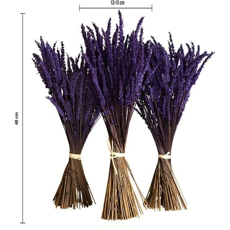 Après la récolte, nous séchons chaque bouquet de manière traditionnelle pour vous offrir notre meilleure sélection de fleurs préservées. Cette technique permet à la fleur de lavande de conserver son parfum délicat et une apparence fraîche et naturelle. Informations et entretien du produit : lot de 3 bouquets sans décoration. Chaque bouquet est composé de 100 à 120 branches.