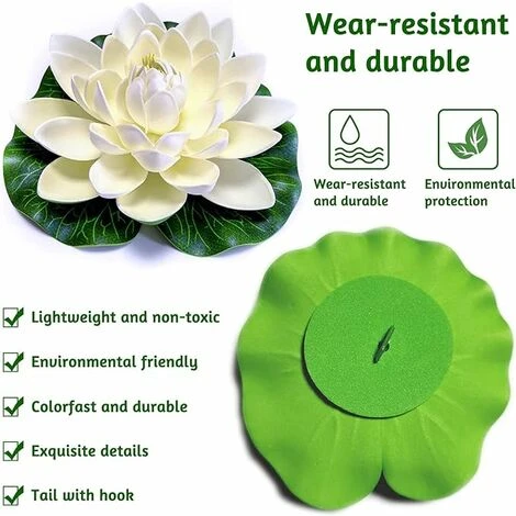 Apparence naturelle: les fleurs de lotus artificielles sont soigneusement produites, les détails sont exquis et cela semble très réaliste. Les fleurs de lotus artificielles flottent sur l’eau, et le poisson aime aussi se cacher dans le lotus en mousse. Vos invités les confondent même facilement comme un vrai lotus.Matériaux de sécurité: Le matériau du lotus artificiel est fait de mousse EVA douce. Il est non toxique et respectueux de l’environnement. Il a une excellente hydratation étanche et une résistance anti-élément, une isolation forte, durable, adaptée à l’usage extérieur et intérieur.Renexualité: Parce que les plantes de piscine flottantes sont exposées à l’extérieur dans la plupart des cas, la résistance aux intempéries doit être principalement prise en compte. Notre lotus artificiel est froid et ne s’estompe pas. Qu’il s’agisse de neige, de grêle ou de rayonnement solaire fort, les fleurs de lotus restent colorées.Décoration exquise: Les fleurs de lotus artificielles ne conviennent pas seulement à la décoration de vos aquariums, réservoirs de poisson, étangs, jardins, piscines, fontaines, etc. d’une manière romantique et animée. Il peut également être utilisé comme accessoires de scène et des fleurs de danse à la main pour fournir une merveilleuse apparence pour les performances de scène.Occasions d’application: les plantes étanches d’étang conviennent aux restaurants, aux familles, aux mariages du jardin, aux fêtes, à la décoration du festival, etc. Les écoles, les universités, les clubs de théâtre et les aquariums ont également besoin de ces beaux lotus artificiels comme scène, accessoires ou décorations.