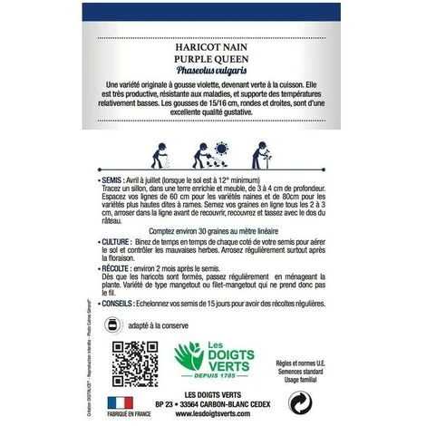 Le Haricot nain purple queen est une variĂ©tĂ© originale Ă gousse violette, devenant verte Ă la cuisson. Elle est très productive, rĂ©sistante aux maladies, et supporte des tempĂ©ratures relativement basses. Les gousses de 15/16 cm, rondes et droites, sont d’une excellente qualitĂ© gustative.