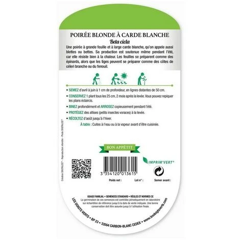 Une poirée à grande feuille et à large carde blanche, qu’on appelle aussi blettes ou bettes. Sa production est soutenue même pendant l’été, car elle résiste bien à la chaleur. Les feuilles se préparent comme des épinards, alors que les tiges peuvent se préparer comme des côtes de céleri branche ou du fenouil.